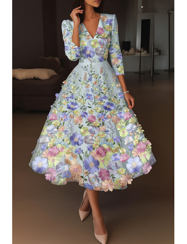A-الخط طول الساق فساتين متنوعه أنيق عتيق زهري نصف كم V رقبة حفلة في الحديقة زفاف جيبة ساتان أورجنزا مع طباعة الأزهار زهرة مطرزة جيبة