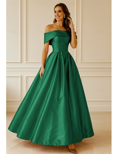 A-الخط طول الأرض فساتين السهرة منفوش الزي الرسمي أنيق حريري كم طويل دون الكتف زفاف رسمي جيبة ساتان ستان مطاطي مع طيات حصى
