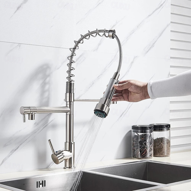 [الخامة والمادة]: مصنوع من نحاس عالي الجودة بتشطيب كروم أنيق، تم تصميم هذا الصنبور المطبخي لضمان المتانة ومقاومة التآكل، مما يوفر مظهرًا لامعًا وأنيقًا يكمل أي ديكور مطبخي عصري. [النمط والشكل]: يتميز بتصميم عصري وصناعي، هذا الصنبور المثبت فوق السطح مثالي للمساحات المطبخية الحديثة. نمط الرش القابل للسحب وتكوين المقبض الواحد يوفران كل من الوظائف والجاذبية البصرية، بينما يضيف تصميم الربيع الملفوف لمسة جريئة ويسمح بمدى وصول ومناورة موسعين. [أهم معالم التصميم]: يتميز هذا الصنبور برأس رش قابل للسحب مرن لراحة الاستخدام وتنوعه خلال مختلف المهام في المطبخ. يوفر مقبض الرفع المفرد تحكمًا دقيقًا في درجة حرارة الماء وتدفقه، مما يجمع بين العملية والجمالية الأنيقة. بالإضافة إلى ذلك، يتضمن الصنبور صمامًا سيراميكيًا يعمل بسلاسة لضمان قابلية التشغيل وطول العمر. [مناسبات الاستخدام]: مثالي لجميع أنواع الإعدادات الحديثة للمطبخ، من المنازل السكنية إلى الشقق الحضرية العصرية. يعد هذا الصنبور مثاليًا للمهام اليومية في المطبخ مثل شطف الخضروات، ملء الأواني، وغسل الأطباق بسهولة وأناقة. [الحجم والتوافق]: تم تصميم الصنبور للتثبيت من خلال ثقب واحد ويشمل مقبضًا واحدًا لسهولة الاستخدام. وهو متوافق مع مختلف خراطيم إدخال الماء، مما يجعله مناسبًا لمختلف البلدان، مما يضمن ملاءمته لأنظمة السباكة في المطابخ بشكل فعال.