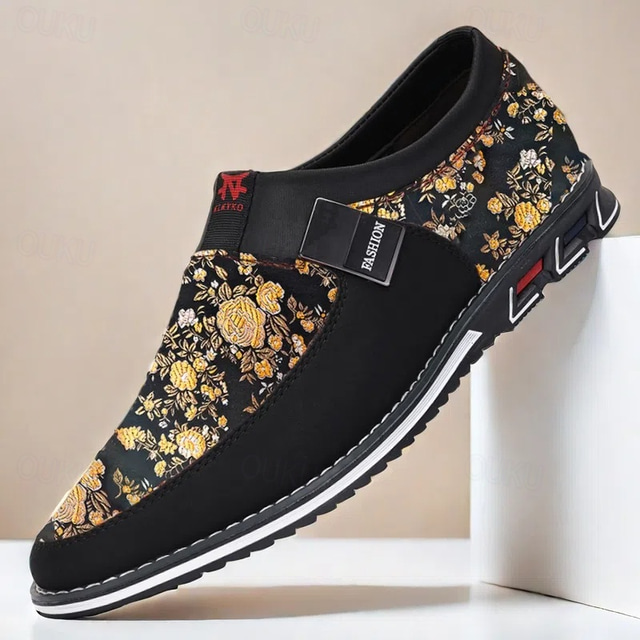 حذاء رياضي رجالي سهل الارتداء باللونين الأسود والذهبي مزين بالزهور - حذاء عصري من قماش الجاكار للارتداء غير الرسمي والمناسبات الأنيقة