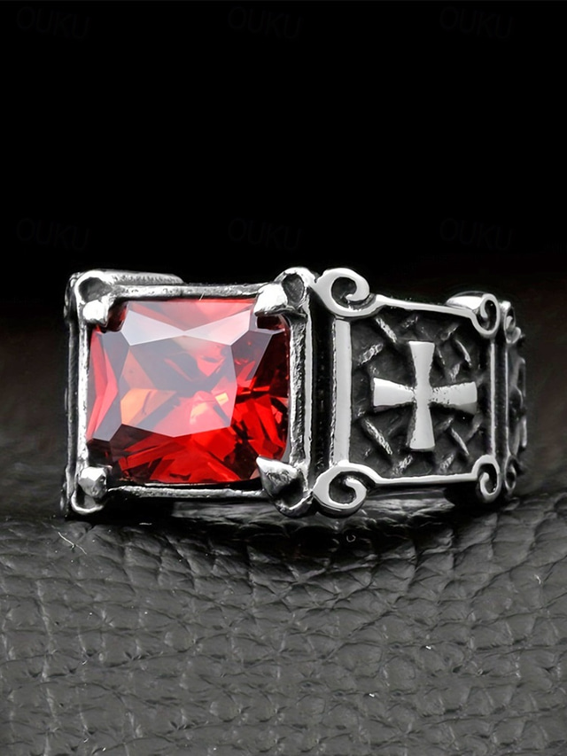 خاتم صليب قوطي للرجال - مادة سبائك، تصميم أحجار كريمة باللونين الأسود والأحمر، طراز عتيق مع زخارف دينية، هدية عيد الميلاد المثالية للمناسبات الرسمية وغير الرسمية