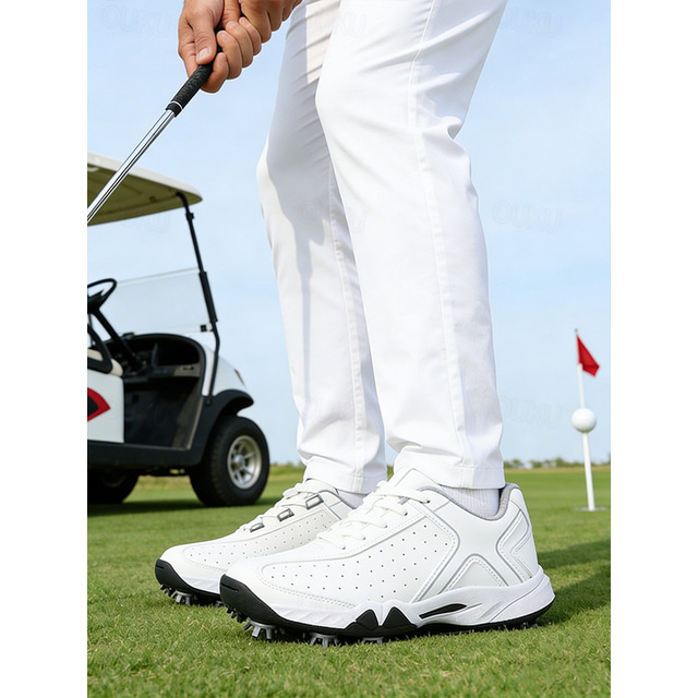 أحذية غولف رجالية، مصنوعة من الجلد الصناعي الأبيض مع لمسات سوداء، بتصميم رياضي، خفيفة الوزن وجيدة التهوية، مناسبة لملاعب الغولف والرياضات الخارجية والتدريب.