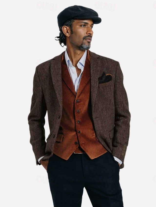 رجالي تويد السترة طوق الشق عتيق عتيق / معتق عظمة الرنكة Blazer بني قياس أساسي ستاندرد زر واحد برستد