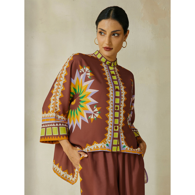 بلوزة من الساتان بتصميم هندسي بوهيمي بأكمام مجرية ورقبة دائرية