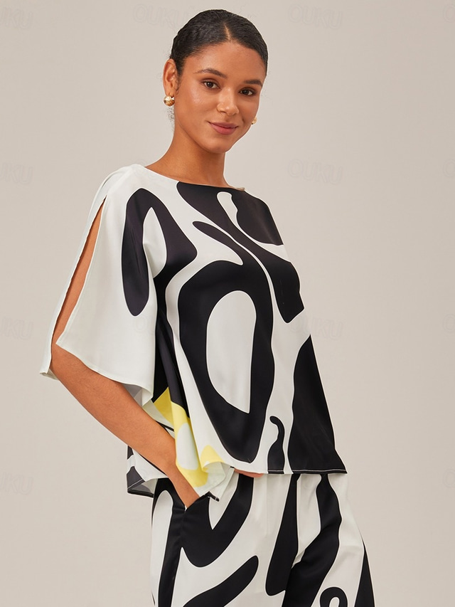 قميص حرير ساتان بأكمام مجرية وبلوزة جرافيكية فضفاضة