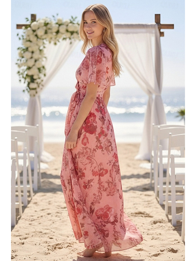 عامودي فستان الاشبينة V رقبة كم قصير أنيق طول الأرض شيفون مع شريطة