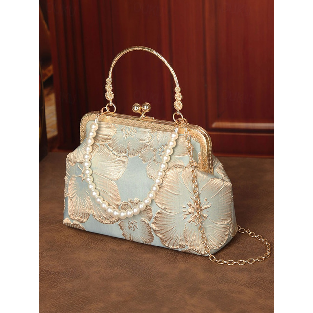 حقيبة كلاتش نسائية أنيقة بمقبض من اللؤلؤ - تصميم مطرز بالورود مع حواف ذهبية، خيارات متعددة الألوان، مثالية لحفلات الزفاف والحفلات والمناسبات الرسمية