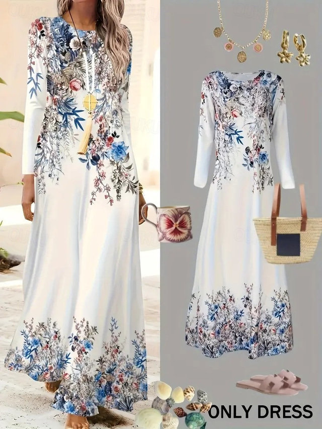 نسائي فستان طويل فستان شيث فستان شكل حرف A كاجوال بوهو مناسب للبس اليومي ضيف حفل زفاف تخرج عادي ورد الرسم كم طويل رقبة عالية مدورة أبيض الربيع الخريف الشتاء فصل الخريف