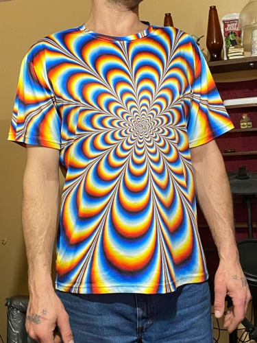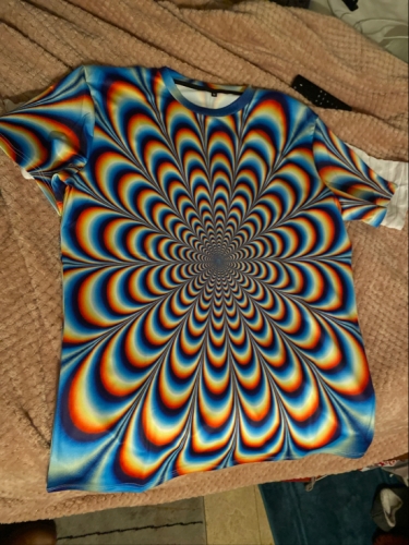 Super fun psychedelic shirt. The fabric is silky; not like t-shirt material. The neck line is a little too snug. But I think we can stretch it out a bit to be more comfortable. The print looks clear and clean. Its only slightly pixelated, but not enough to effect the clarity of the print. Super fun psychedelic shirt. The fabric is silky; not like t-shirt material. The neck line is a little too snug. But I think we can stretch it out a bit to be more comfortable. The print looks clear and clean. Its only slightly pixelated, but not enough to effect the clarity of the print.