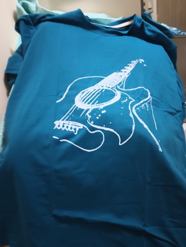 My guitar music lovin friends birthday is in June...so, a gift. This t shirt is so cool, I would get another for myself. Nice ocean teal blue. My guitar music lovin friends birthday is in June...so, a gift. This t shirt is so cool, I would get another for myself. Nice ocean teal blue.