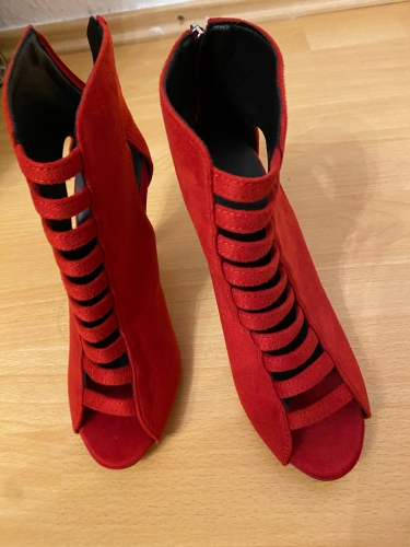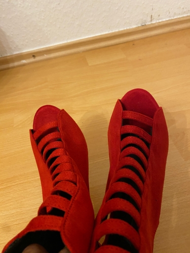 حذاء نسائي بكعب عالٍ أحمر اللون مع تفاصيل فيونكة وحزام للكاحل - حذاء أنيق للحفلات من الجلد السويدي