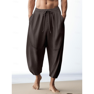Men's Linen Pants Summer Pants Cropped Pants Beach Pants Drawstring Elastic Waist Plain Comfort Breathable Calf-Length Casual Daily Holiday Fashion Classic Style Black White
