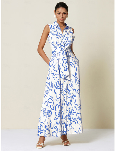 Women's Sleeveless Maxi Shirt Dress Summer A Line Shirt Collar With Belt Curve Pocket Linen Look Fabric Waist Slim Fit Blue Green Beige