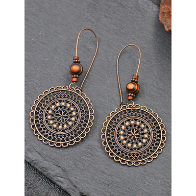Women's Alloy & Wood Round Drop Earrings, Vintage Boho Mandala Design, Lightweight Statement Style, Perfect for Casual Everyday Wear, Beach Vacation & Summer Outfits