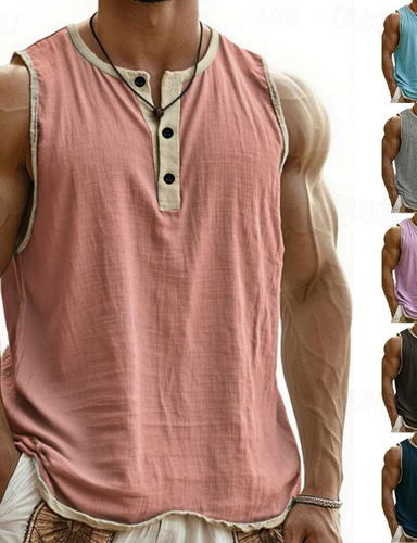 Men's Linen Shirt Tank Top Vest Top Undershirt Sleeveless Round Neck Mandarin Collar Summer Spring & Summer Plain Fashion Designer Basic Buttons Button Front Vacation Street Casual Black Pink Wine