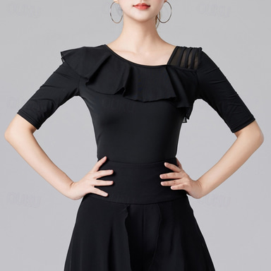 Latin Dance Top Ruffles Pure Color Splicing Women's Performance Training Half Sleeve High Nylon
