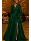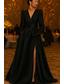 A-Line Floor Length Evening Gown Ball Gown Formal Dress Elegant Glittering High Split Long Sleeve V Neck Wedding Formal Pocket Satin Sequined with Glitter Pleats Pocket