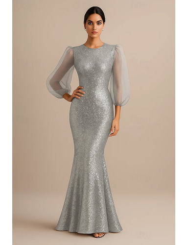 Mermaid Trumpet Floor Length Evening Gown Elegant Glittering Celebrity Style Long Sleeve Crew Neck Garden Party Wedding Organza Sequined with Glitter