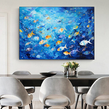 Hand painted Abstract Swimming Fishes Oil Painting on Canvas Extra Large Handmade Wall Art Blue Ocean Art painting Custom Painting Minimalist artwork for Living Room Decor
