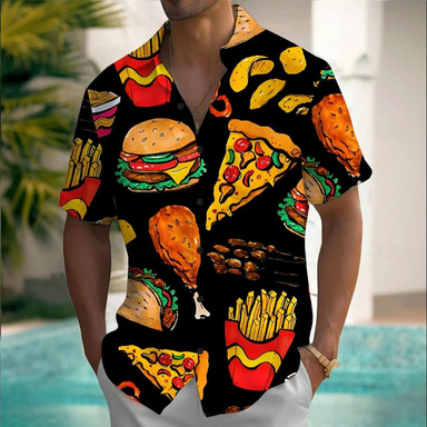 Men's Fruit Food Hamburger Summer Hawaiian Shirt Button Up Shirt Aloha Shirt Short Sleeve Hawaiian Holiday Beach Wear Summer Spring Turndown 3D Print Collared Shirts Front One Pocket Black Orange