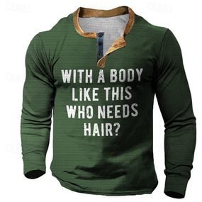 Men's Funny Long Sleeve Henley Shirt - 'WITH A BODY LIKE THIS WHO NEEDS HAIR?' Graphic Lifestyle Tee