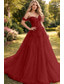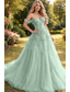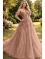 A-Line Floor Length Prom Dresses Elegant High Split Short Sleeve Off Shoulder Formal Tulle with Pearls Sequin Embroidery