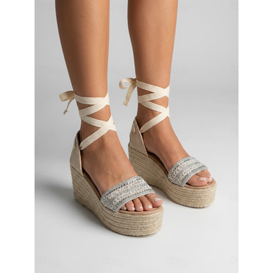 Women's Beige Espadrille Wedge Sandals with Ankle Ties and Sequins – Vacation & Resort Evening Shoes