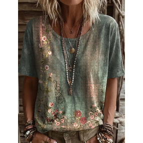 Women's T Shirt Print Floral Graphic Geometric Vintage Stylish Casual Short Sleeve Crew Neck Regular Tops Casual Daily Weekend Black Pink Dusty Blue Brown Summer Spring