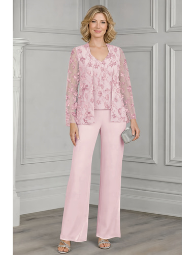 Kalhoty 3 kusový oblek Kalhotový oblek Na zem Šaty pro matku nevěsty Dlouhý rukáv Do V Elegantní Jednoduchý Na běžné nošení Formální Svatební host Šifón s Krajka 3D květiny