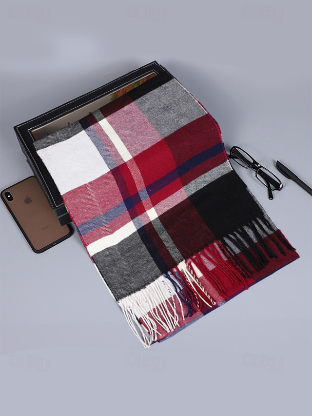 Pánská vánoční kostkovaná šála – stylová polyesterová šála s třásněmi – dostupná v několika barvách – teplý sváteční doplněk pro muže