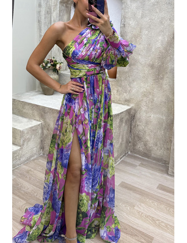 Damen Langes Kleid Maxikleid Abschlussballkleid Partykleid Chiffonkleid Druckkleid Elegant Mode Party Besonderer Anlass Normale Passform Blume Langarm Ein-Schulter Gelb Purpur Grün Sommer