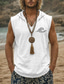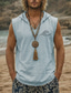 Herren-Weste mit Kapuze, ärmellos, mit Meereswellen-Print, Boho-Stil, lockerer Passform, V-Ausschnitt, ausgefranstem Saum, aus Baumwoll-Leinen-Mischgewebe, ideal für Strandurlaub und Surfen. Größen: