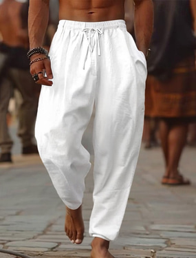 Herren Jogginghose Jogger Leinenhose Hose Hosen Sommerhosen Kordelzug Falten Glatt Komfort Draussen Urlaub Täglich Festtage Modisch Weiß