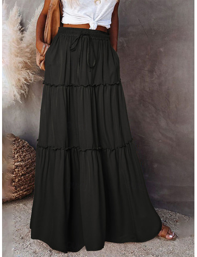 Damen Lose Rock Maxi Hoher Taillenbund Röcke Rüschen Rüsche Kordelzug Einfarbig Strasse Täglich Sommer Polyester Baumwolle und Leinen Modisch Brautkleider schlicht Violett Schwarz Gelb Rote