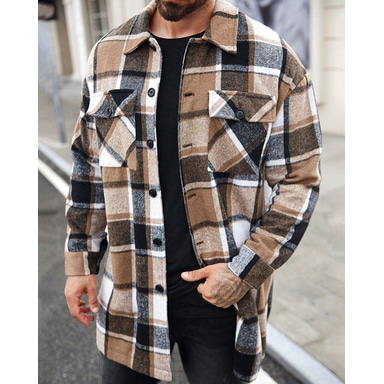 Herren Shacket Hemdjacke Winterjacken Karomuster Urlaub Alltagskleidung Schwarz Wein Orange Khaki Langarm Revers Herbst Winter Bekleidung Tasche