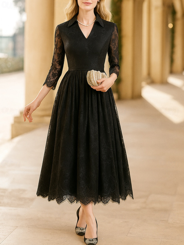 A-Linie Tee-Länge Partykleid Cocktailkleid Kleid für Hochzeitsgäste Brautmutterkleid Dreiviertelarm V Ausschnitt Elegant Formell Formeller Abend Hochzeitsfeier Tüll mit Spitze