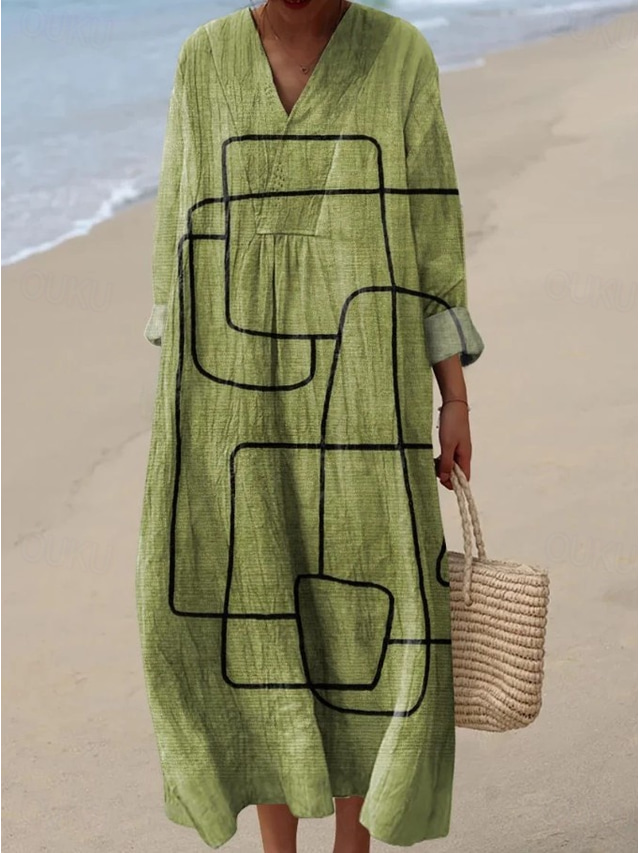 Kleiderarten: Sommerkleid, Shiftkleid, Stoff: Polyester, Geschlecht: Damen, Design: Druck, Patchwork, Anlass: Strand, Ausgehen, Stil: Urlaub, Lässig, Druckart: Druck, Passform: Lässiger Schnitt, Kleid Länge Typ: Maxikleid, Ausschnitt: V Ausschnitt, Ärmellänge: Langarm, Dicke: Mittel, Elastizität: Unelastisch, Pflegetipps: Maschinenwäsche, Muster: Grafik, Abstrakt, Geometrisch, Saison: Sommer, Frühling,