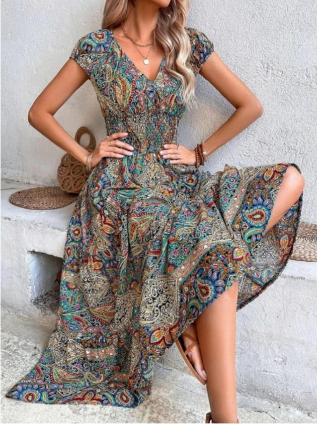 Damen Maxidress Casual kleid Schaukelkleid A Linie Kleid Boho-Kleid Böhmen Ethnisch Brautkleider schlicht Täglich Regular Fit Paisley-Muster Kurzarm V Ausschnitt Blau Sommer Frühling