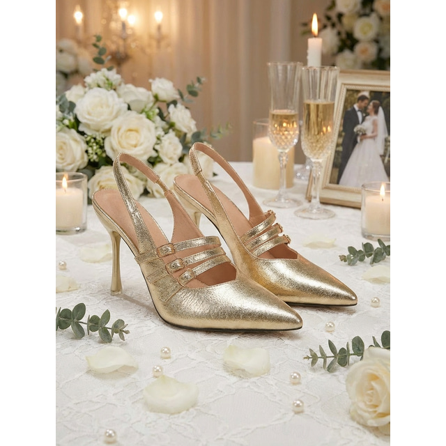 Goldene, spitze Slingback-Pumps für Damen, elegante Riemchenschuhe mit Schnalle für die Mutter der Braut bei Hochzeiten in der Stadt