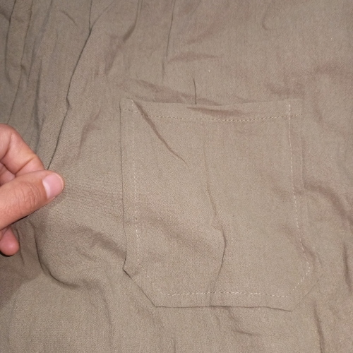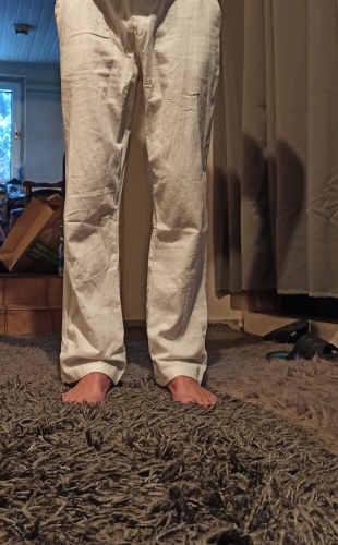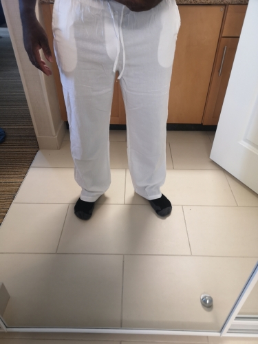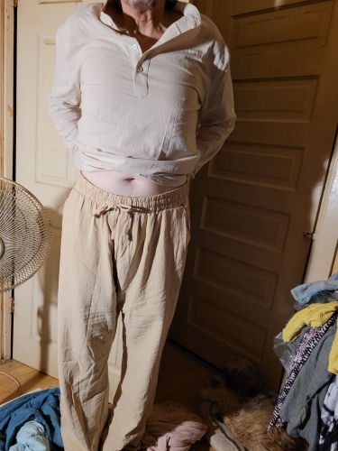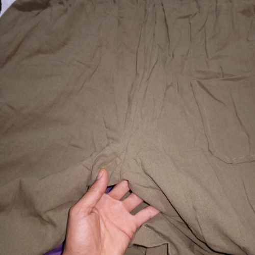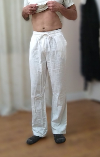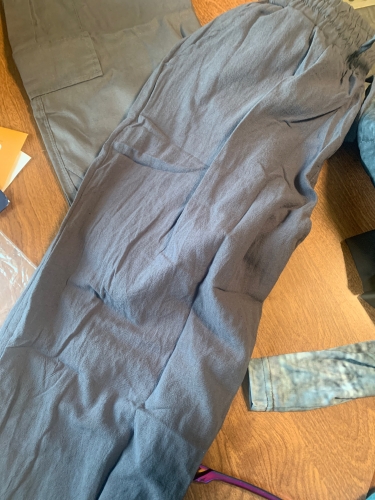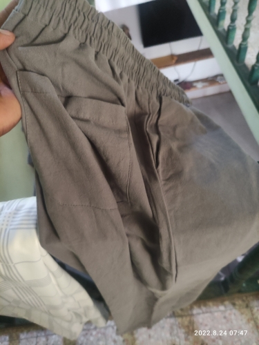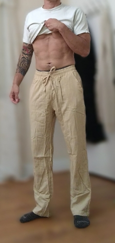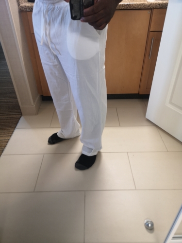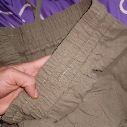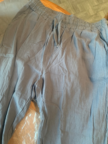 Vienen muy bien los pantalones parecen ser de tela lino. Muy cómodos y frescos. La tela es gruesa pero muy fresca para días calurosos. Van muy bien para la playa. Cuenta con una bolsa trasera en la pompa derecha.