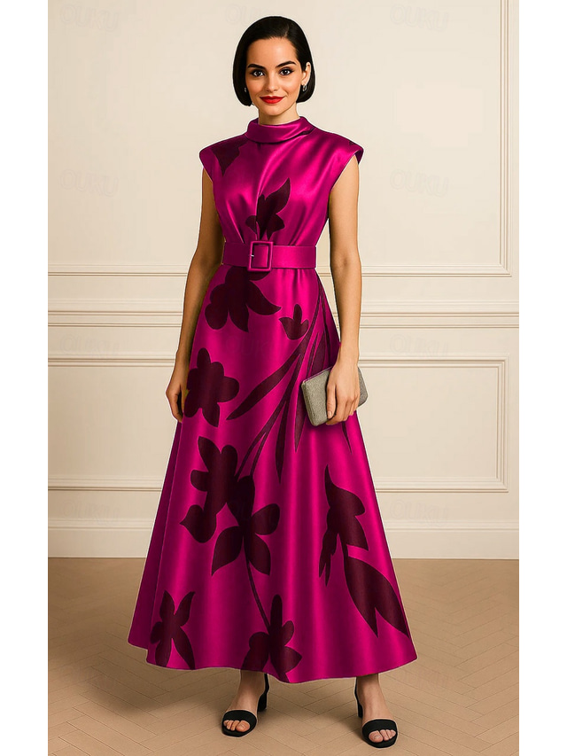 A-Line Ankle Length Cocktail Dresses Flared Dress Elegant Semi Formal Sleeveless High Neck Garden Party Wedding Satin with Floral Print