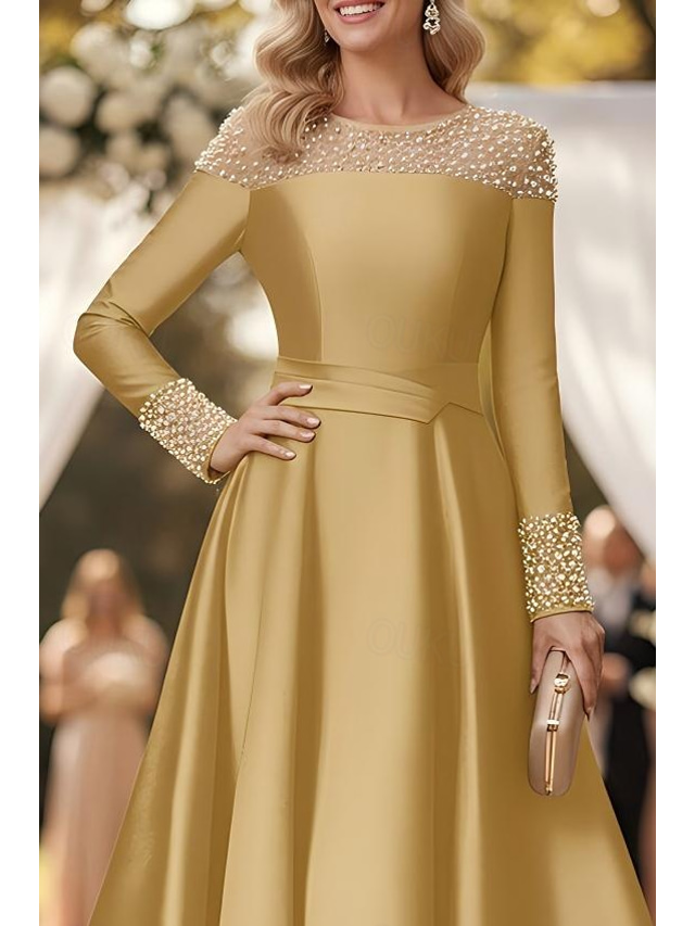 A-Line Ankle Length Party Dress Cocktail Dress Wedding Guest Dress Mother of the Bride Dress Long Sleeve Off Shoulder Elegant Formal Satin with Pearls