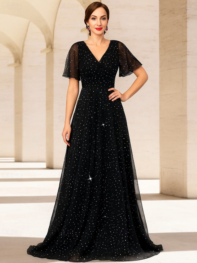 A-Line Floor Length Wedding Guest Dress Formal Dresses Evening Gown Mother of the Bride Dress Short Sleeve V Neck Elegant Vintage Sparkle & Shine with Sequin