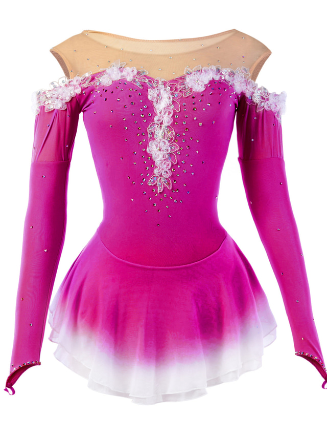 Figure Skating Dress Women's Girls' Ice Skating Dress Yellow Pink Dark Purple Patchwork Mesh Spandex High Elasticity Competition Skating Wear Crystal / Rhinestone Dumb Light Fashion Long Sleeve Ice