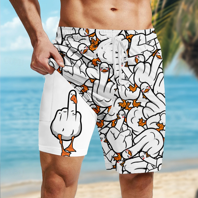 Men's Animal Funny Duck Lined Shorts 2 in 1 Board Shorts Swim Shorts Mid Waist Hawaiian Vacation Holiday Side Pockets With Compression Liner Elastic Drawstring Waist Designer Clothing Apparel