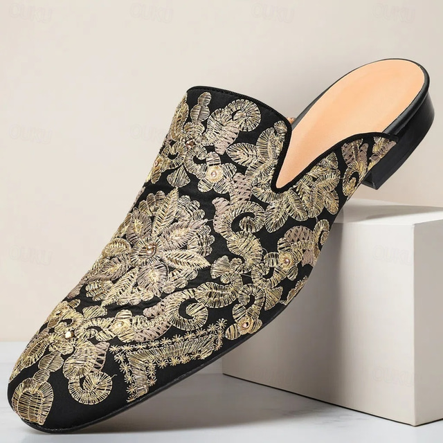 Men's Black Premium Cowhide Mules with Gold Floral Embroidery – Luxury Slip-Ons for Formal Parties, Cocktail Events and Special Occasions