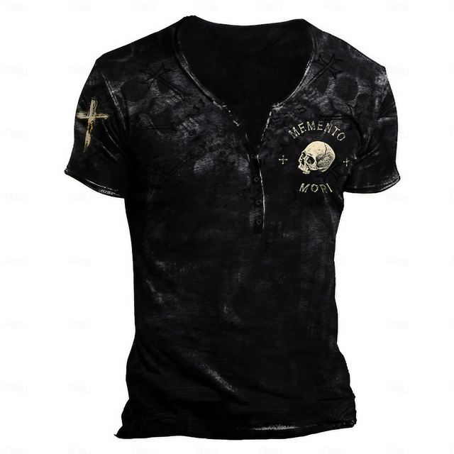 Fabric:Polyester,Gender:Men's,Tops Type:Henley Shirt,T Shirt,Occasion:Daily,Outdoor,Casual,Vacation,Design:Button-Down,Print,Style:Breathable,Lightweight,Vintage,Stylish,Big and Tall,Print Type:3D Print,Fit Type:Regular Fit,Neckline:Henley,Sleeve Length:Short Sleeve,Elasticity:Micro-elastic,Look After Me:Wet and Dry Cleaning,Washable,Pattern:Skull,Graphic Prints,Season:Summer,Shoulder Width (cm):S:44.5;M:46;L:47.5;XL:49;2XL:51;3XL:53,Bust (cm):S:104;M:110;L:116;XL:122;2XL:130;3XL:138,Length (cm):S:70;M:72;L:74;XL:76;2XL:78;3XL:80,Sleeve Length (cm):S:22;M:22.8;L:23.6;XL:24.4;2XL:25.2;3XL:26,
