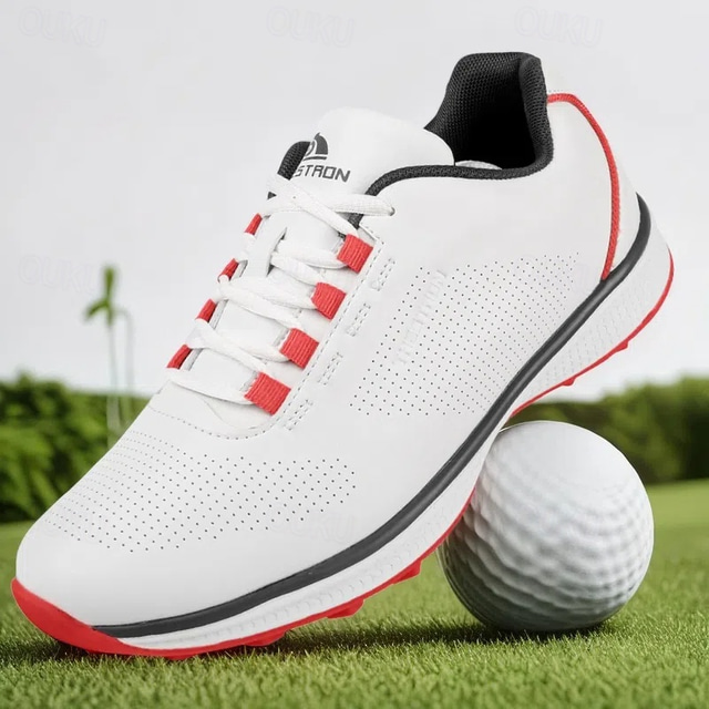 Men's Performance Golf Sneakers in White with Red Laces, Breathable Microfiber, Ideal for Amateur Golfers