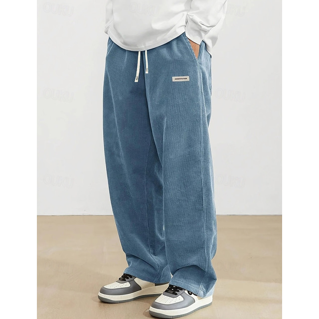 Men's Trousers Corduroy Pants Baggy Pants Casual Pants Straight Leg Sweatpants Drawstring Elastic Waist Solid Color Comfort Full Length Daily Home Outdoor Fashion Chic & Modern Black Navy Blue