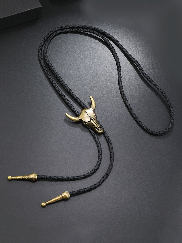 Men's Bull Head Bolo Tie Necklace – Western Cow Skull Pendant with Braided Leather Cord, Vintage Cowboy Style Accessory for Country Concerts, Rodeos and Daily Wear